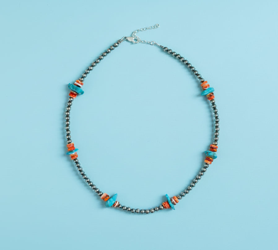 This handcrafted necklace by The Bijoux FAB combines timeless elegance with Southwestern soul. Designed and made in the USA, it features genuine 4mm sterling silver pearls accented with Orange Spiny Oyster and Sleeping Beauty Turquoise chips, blending warmth and vibrant turquoise hues in perfect harmony. Each necklace is slightly unique, showcasing natural stone variations that make every piece one of a kind.